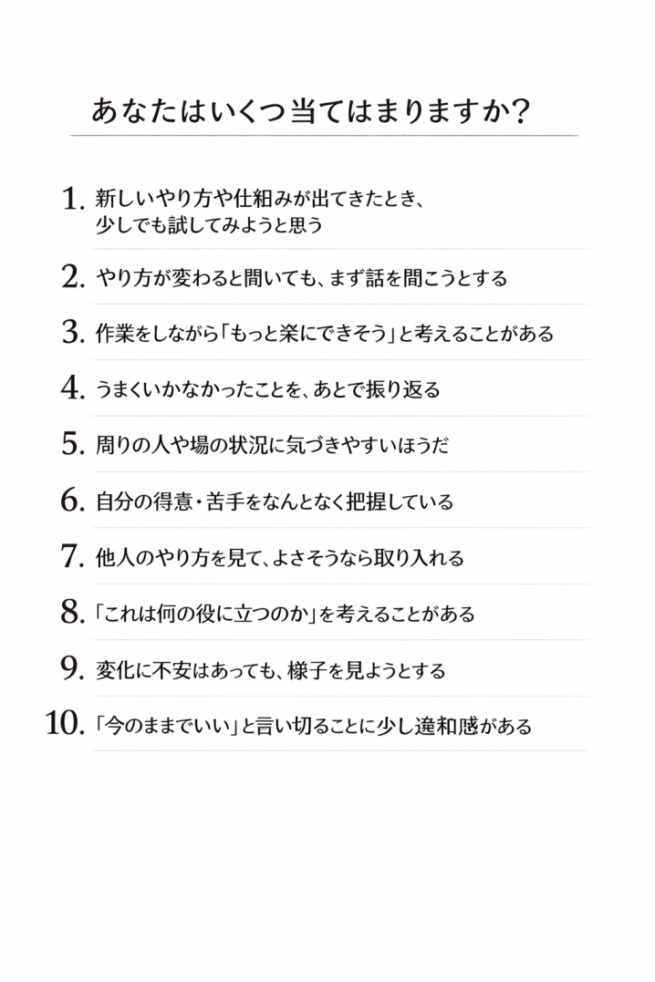 まずは、深く考えずに Yes / No で答えてください。 正解・不正解はありません。 クイズ:あなたはいくつ当てはまりますか? 新しいやり方や仕組みが出てきたとき、少しでも試してみようと思う やり方が変わると聞いても、…